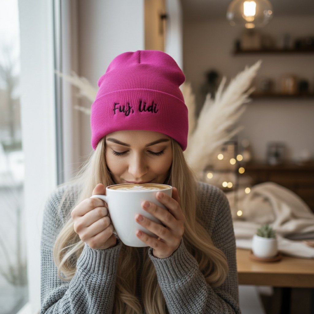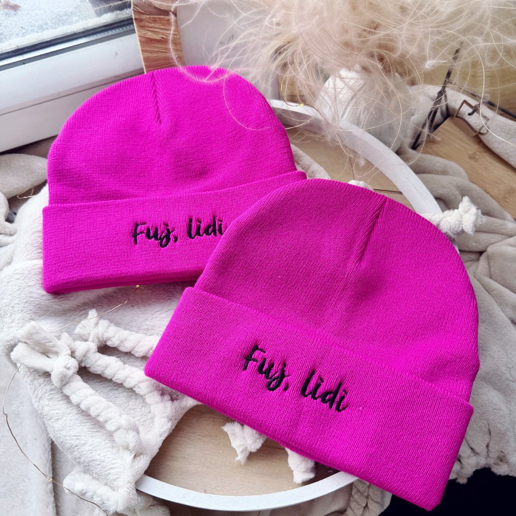 Čepice s výšivkou s autorským motivem z naší dílny.