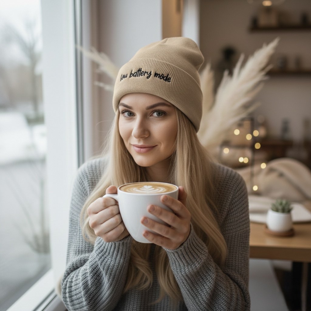 Čepice s výšivkou s autorským motivem z naší dílny.