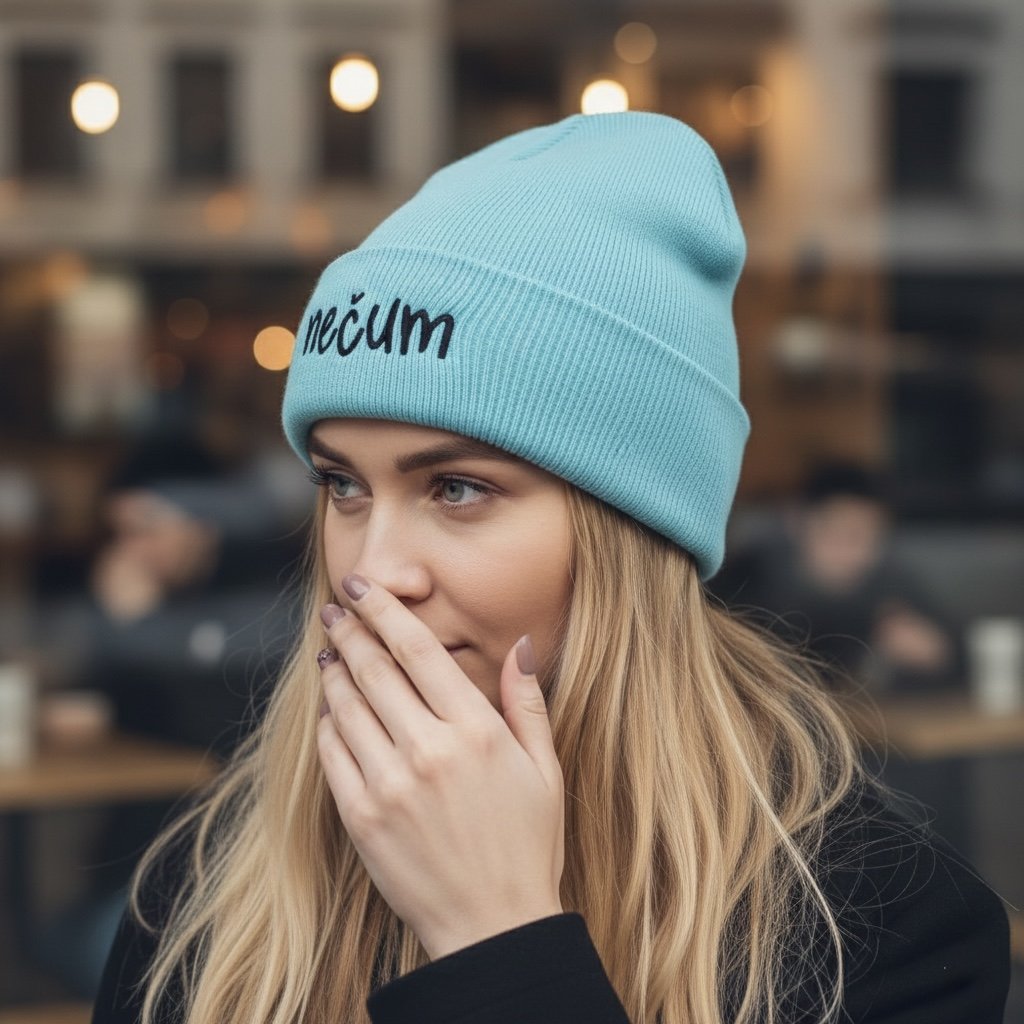 Čepice s výšivkou s autorským motivem z naší dílny.