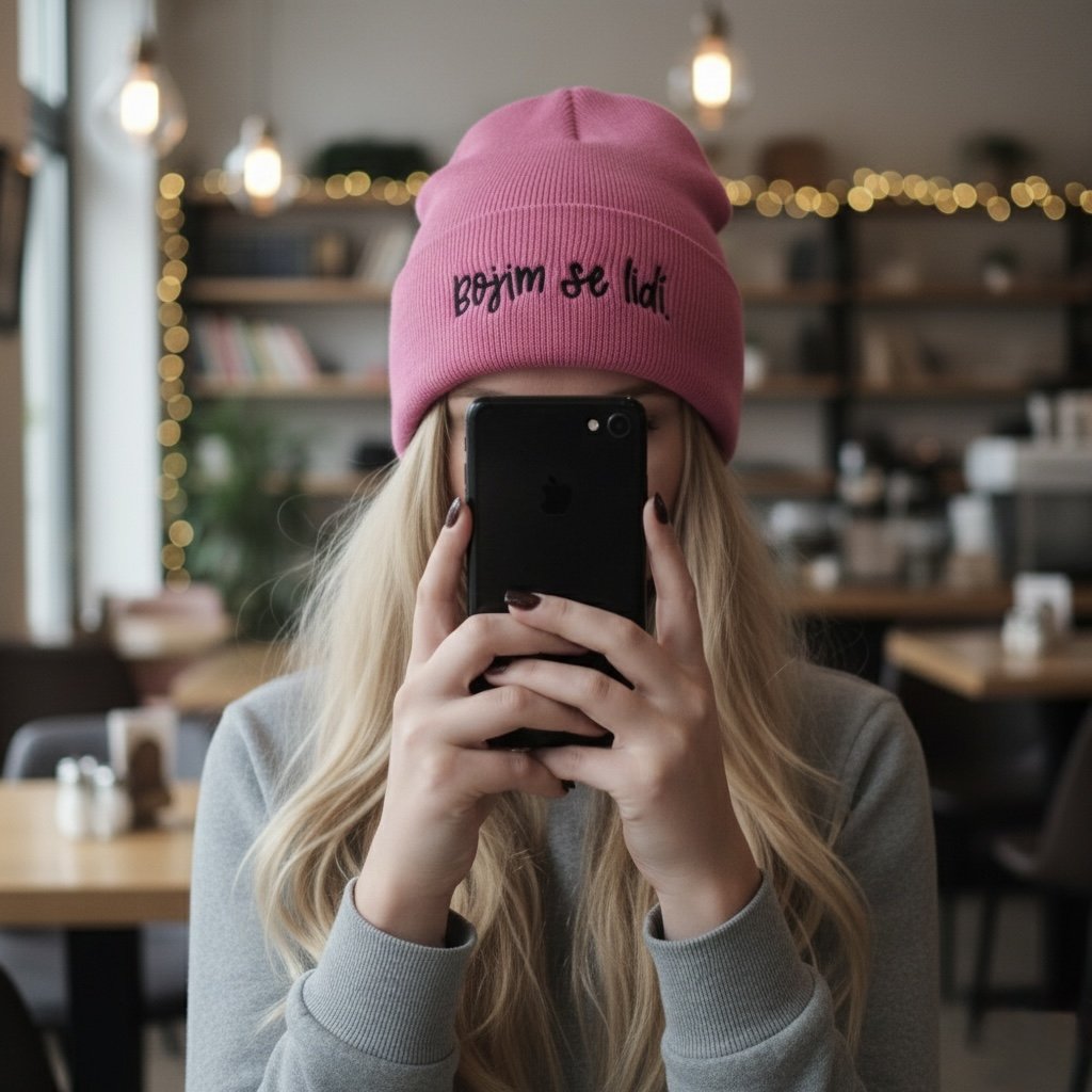 Čepice s výšivkou s autorským motivem z naší dílny.