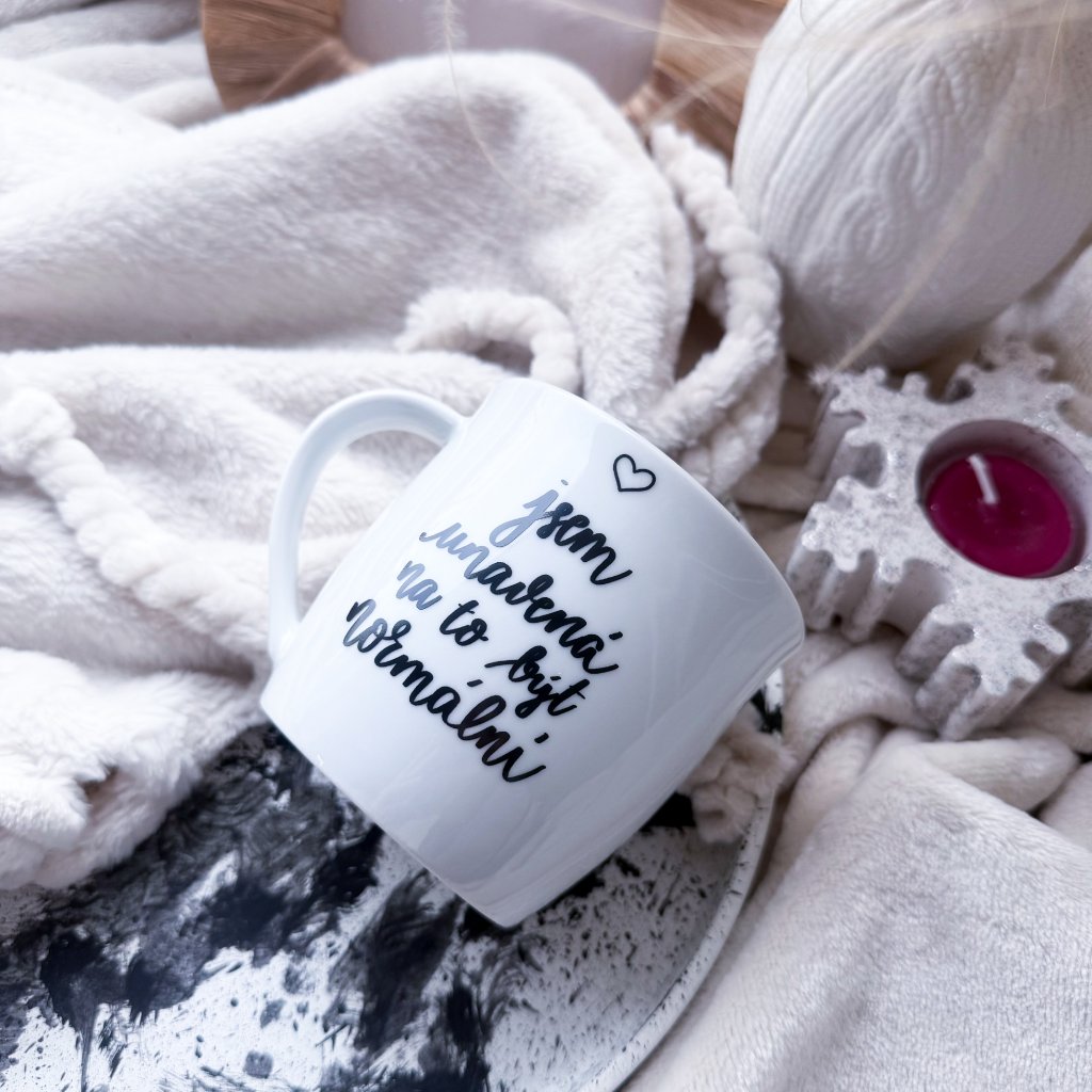 Minimalistický hrnek s autorským motivem psaným ručně naším originálním fontem.