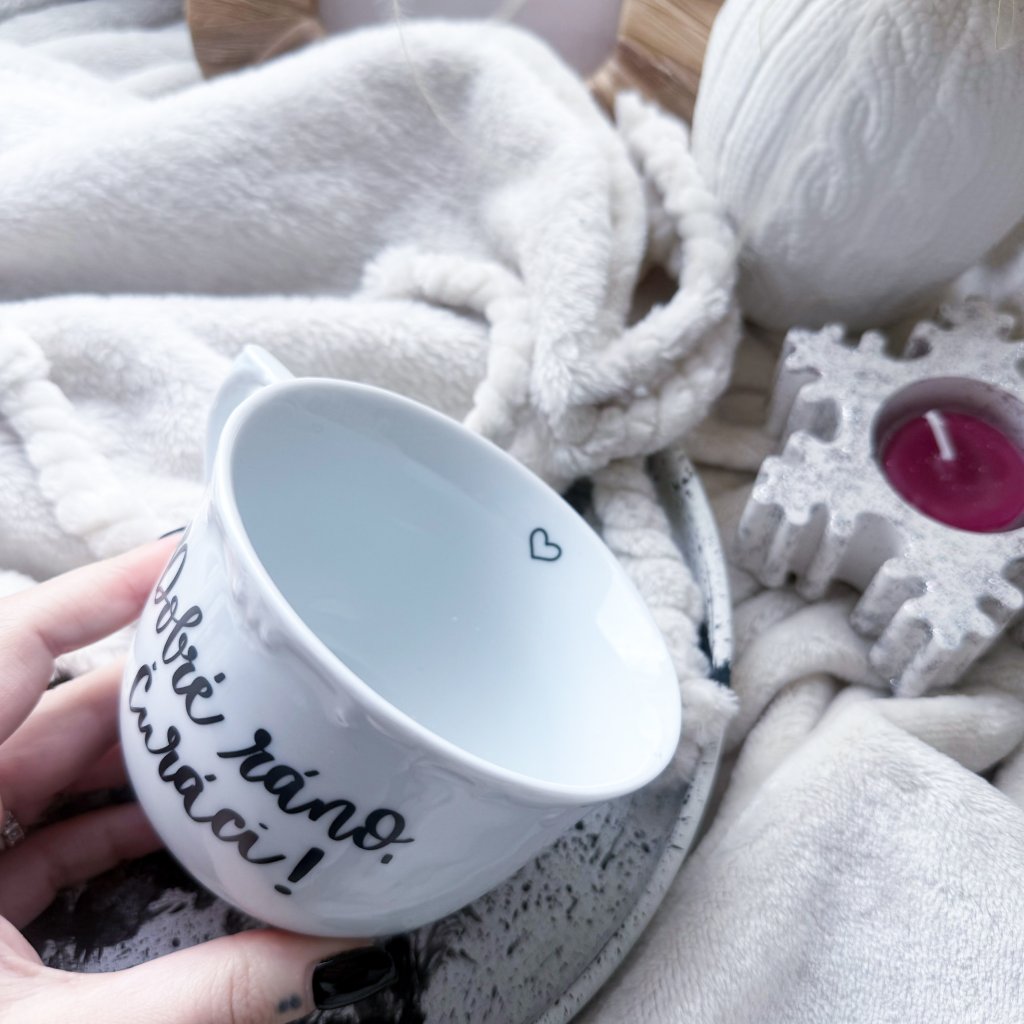 Minimalistický hrnek s autorským motivem psaným ručně naším originálním fontem.