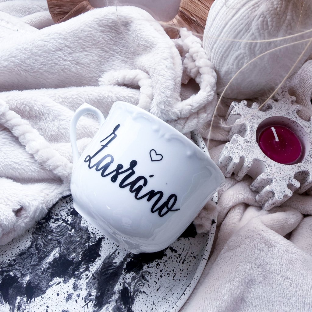 Minimalistický hrnek s autorským motivem psaným ručně naším originálním fontem.