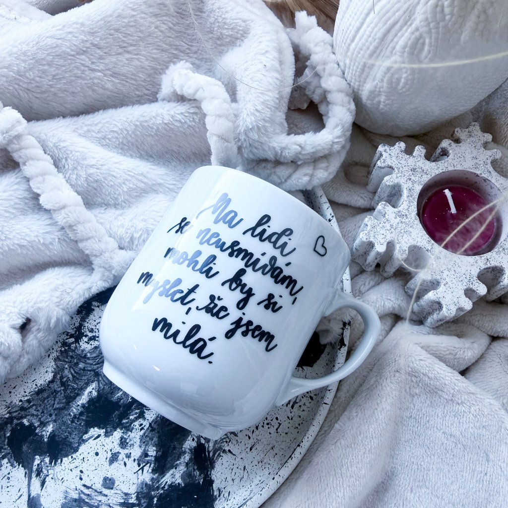 Minimalistický hrnek s autorským motivem psaným ručně naším originálním fontem.