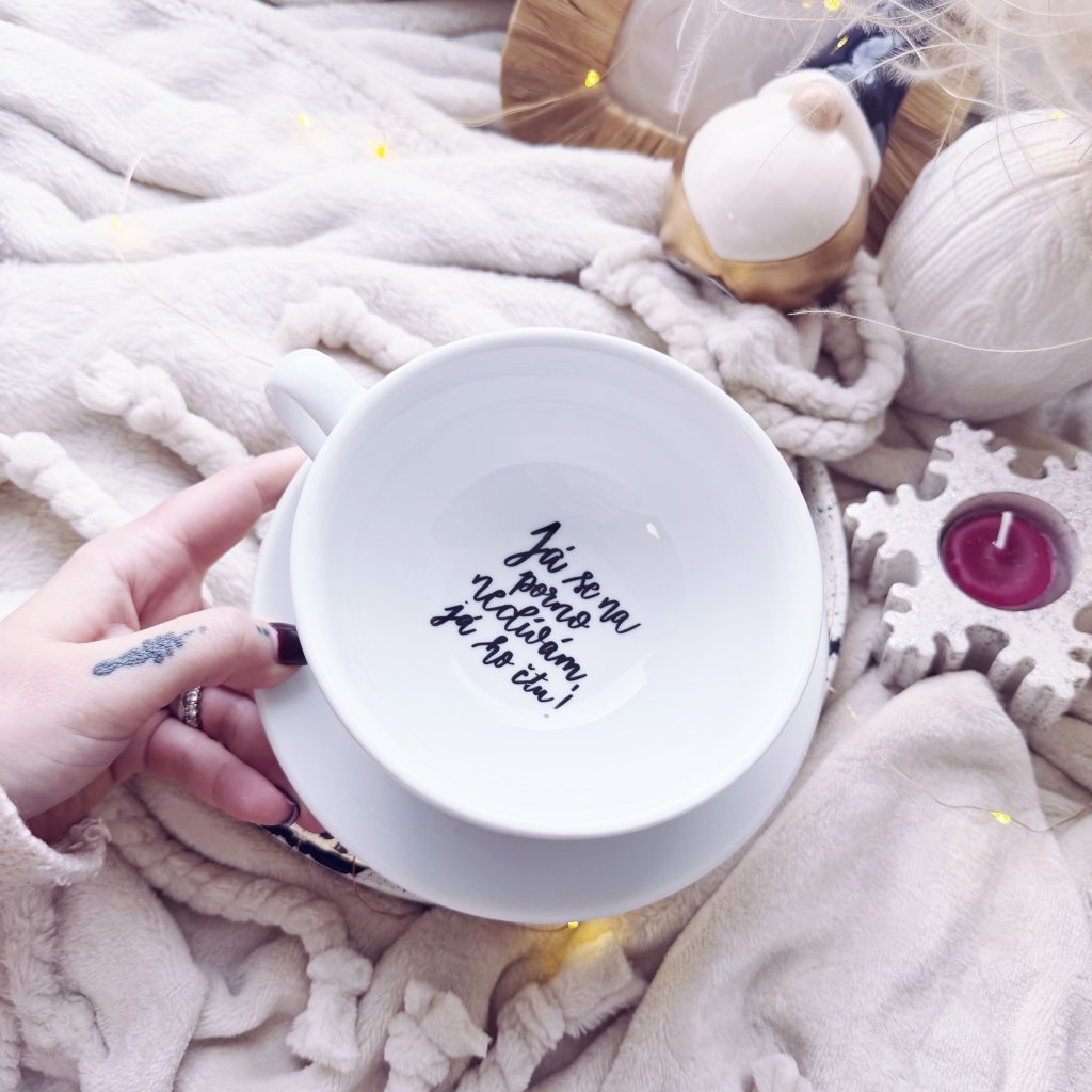 Minimalistický hrnek s podšálkem autorským motivem psaným ručně naším originálním fontem.