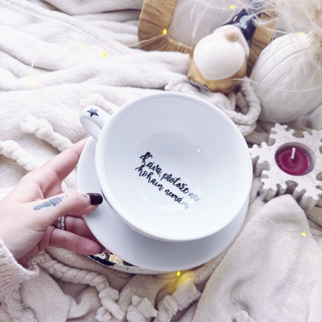 Minimalistický hrnek s podšálkem autorským motivem psaným ručně naším originálním fontem.