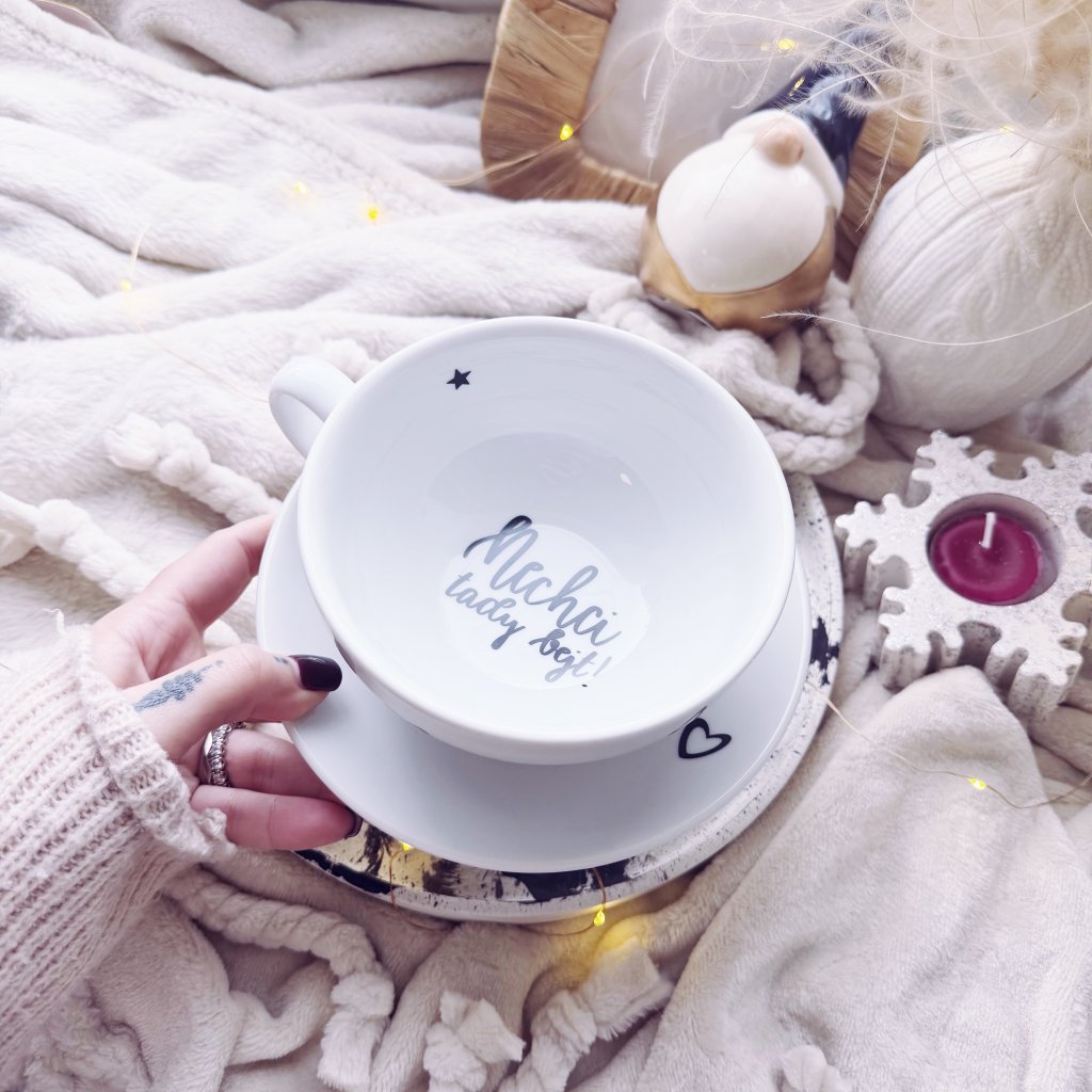 Minimalistický hrnek s podšálkem autorským motivem psaným ručně naším originálním fontem.
