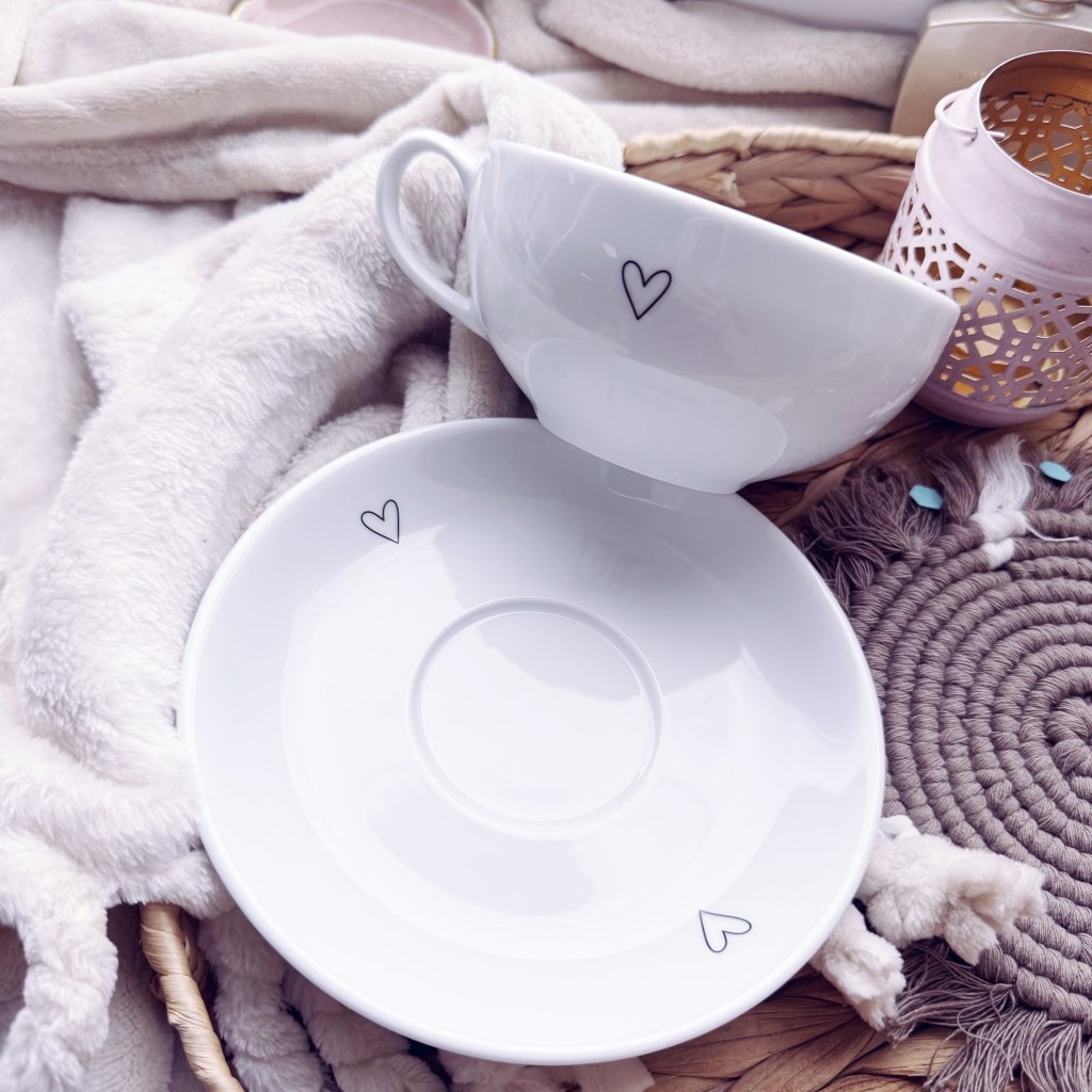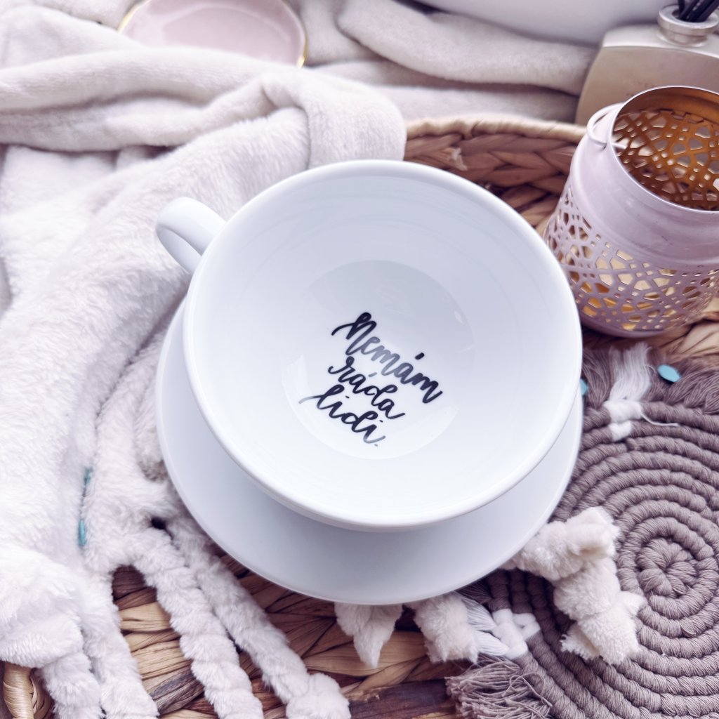Minimalistický hrnek s podšálkem autorským motivem psaným ručně naším originálním fontem.