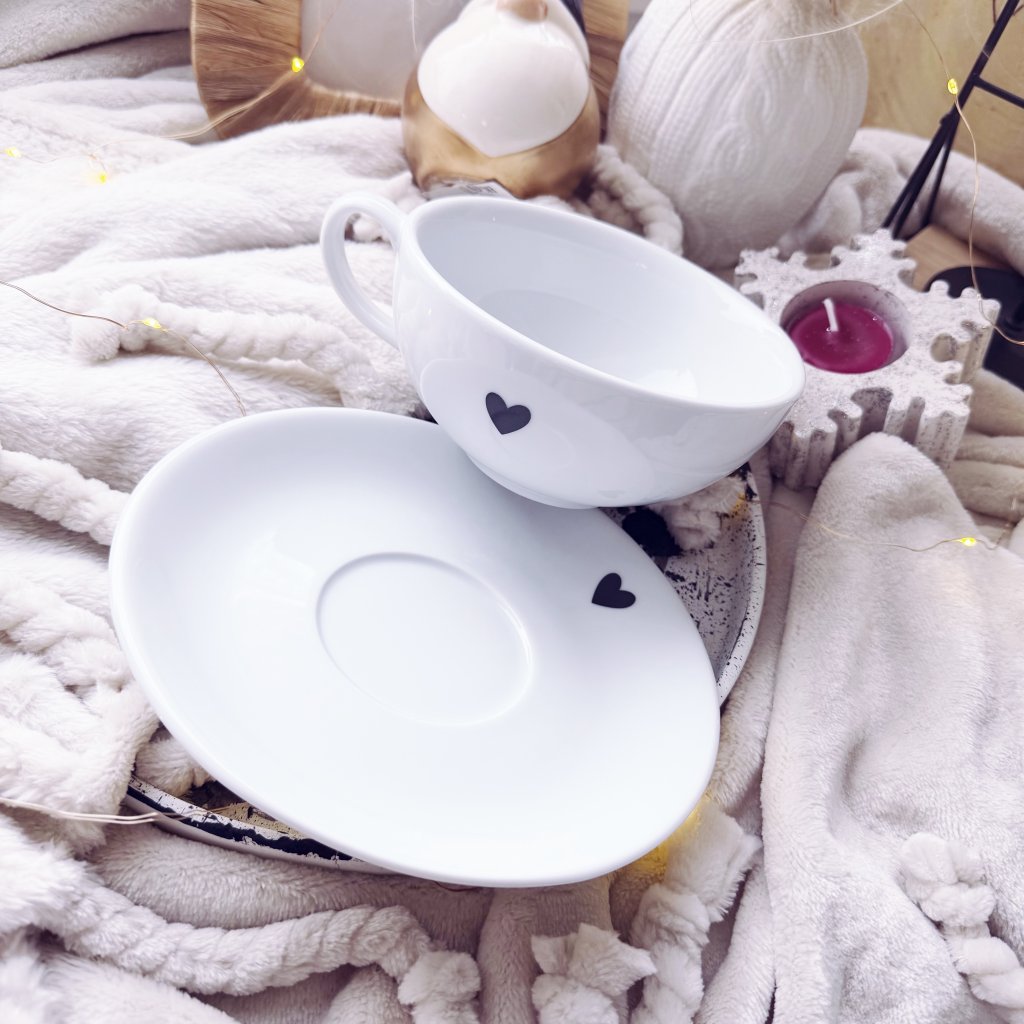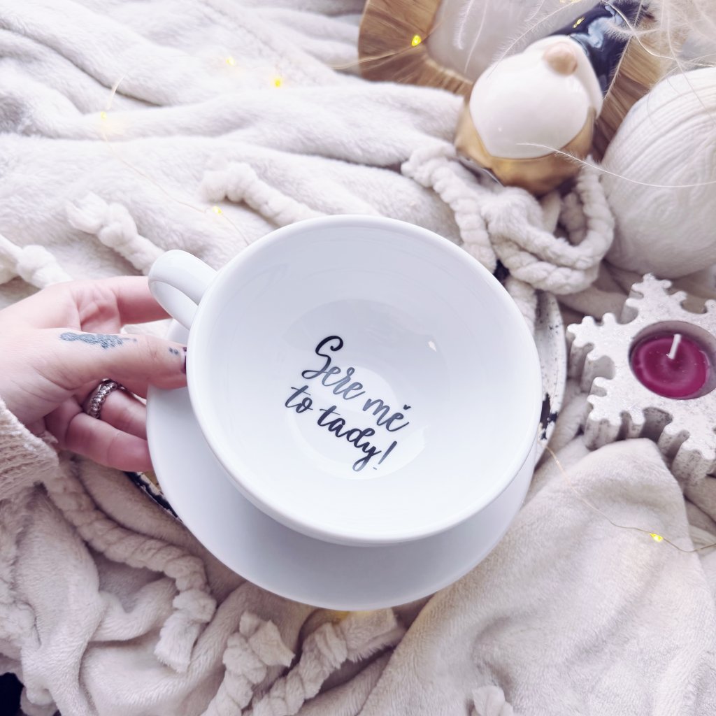Minimalistický hrnek s podšálkem autorským motivem psaným ručně naším originálním fontem.