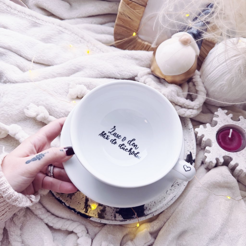 Minimalistický hrnek s podšálkem autorským motivem psaným ručně naším originálním fontem.