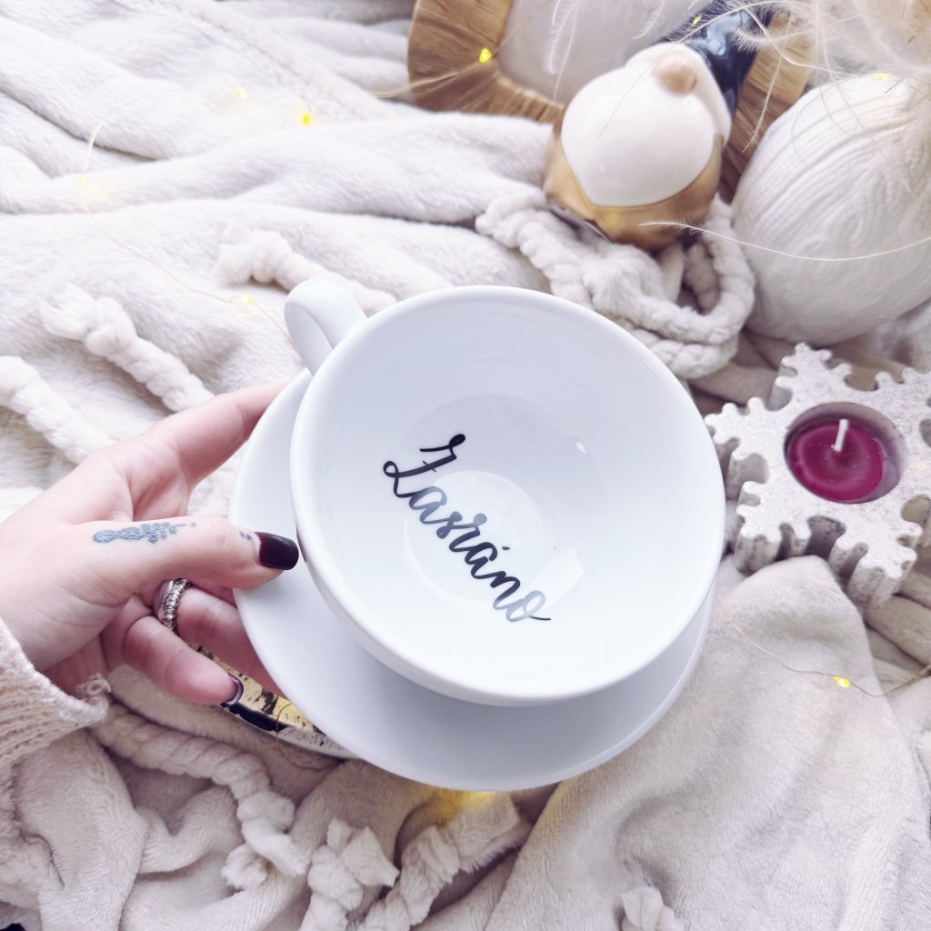Minimalistický hrnek s podšálkem autorským motivem psaným ručně naším originálním fontem.