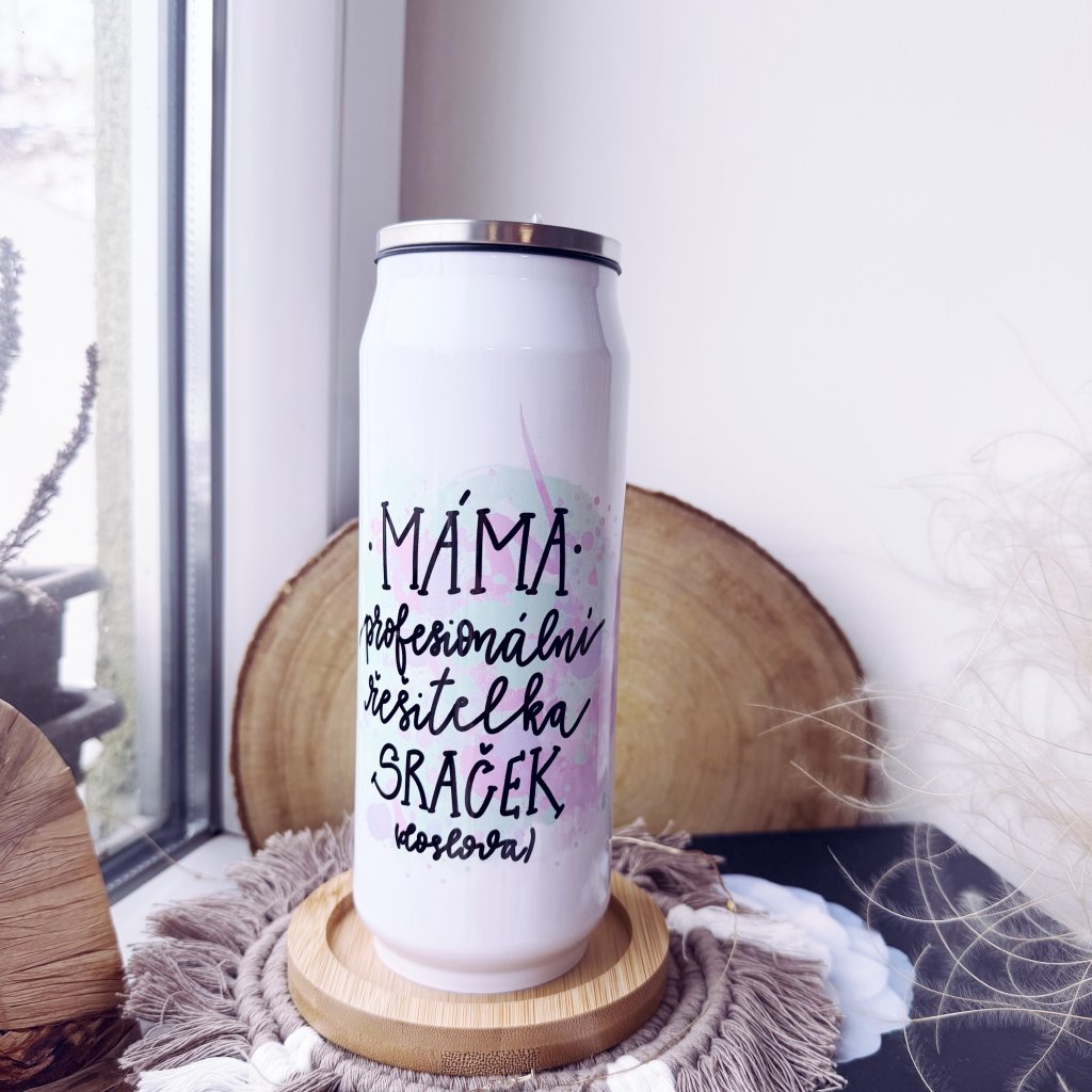 Nerezový dvoustěnný termorhrnek ve tvaru plechovky včetně plastovokovového víčka.