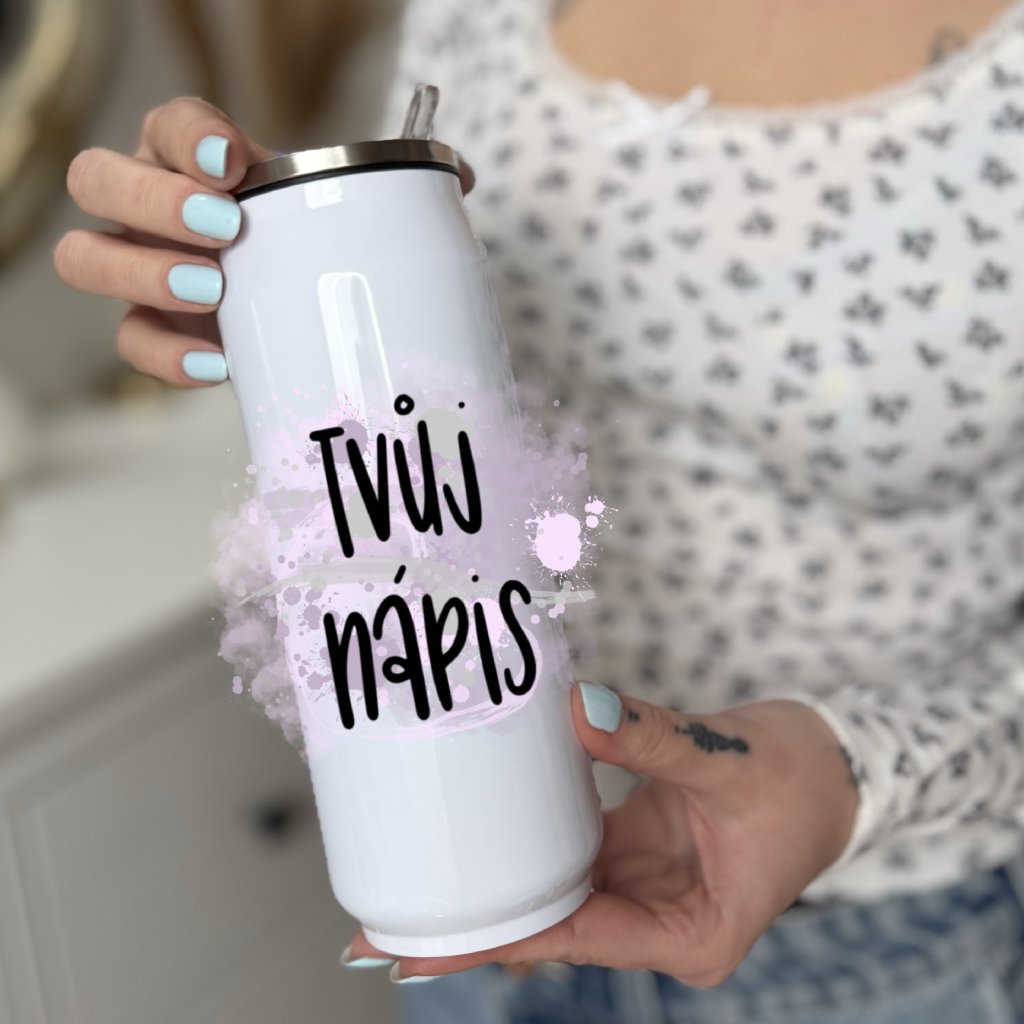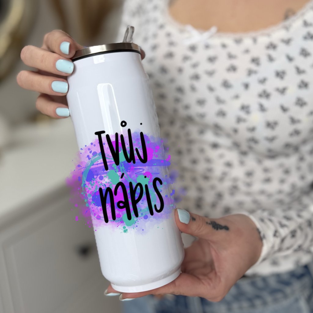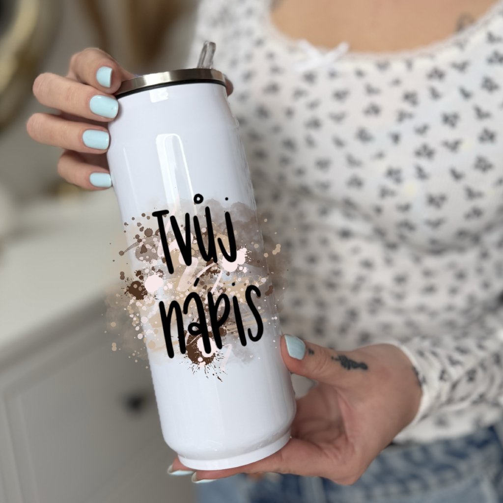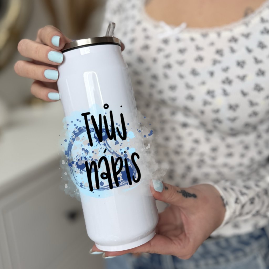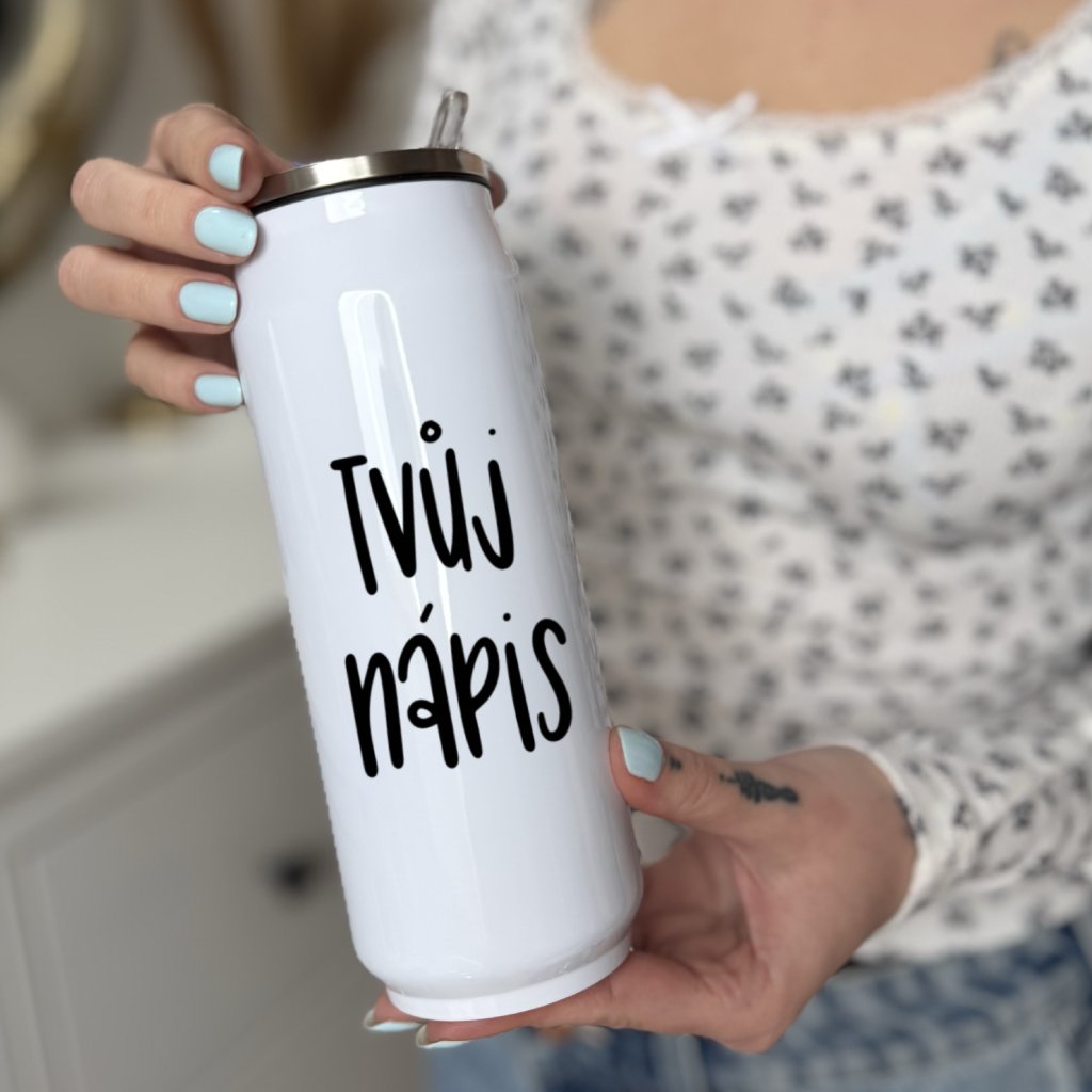 Nerezový dvoustěnný termorhrnek ve tvaru plechovky včetně plastovokovového víčka.