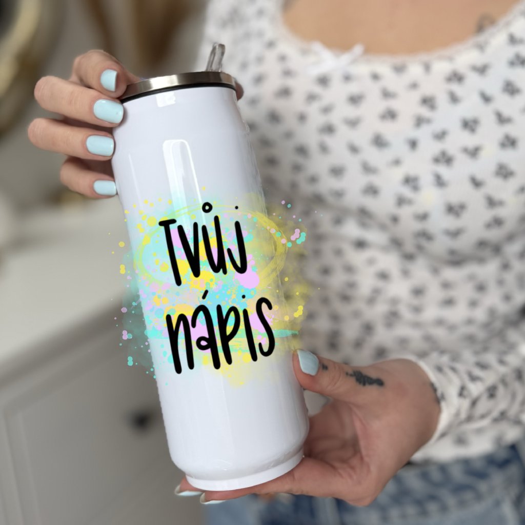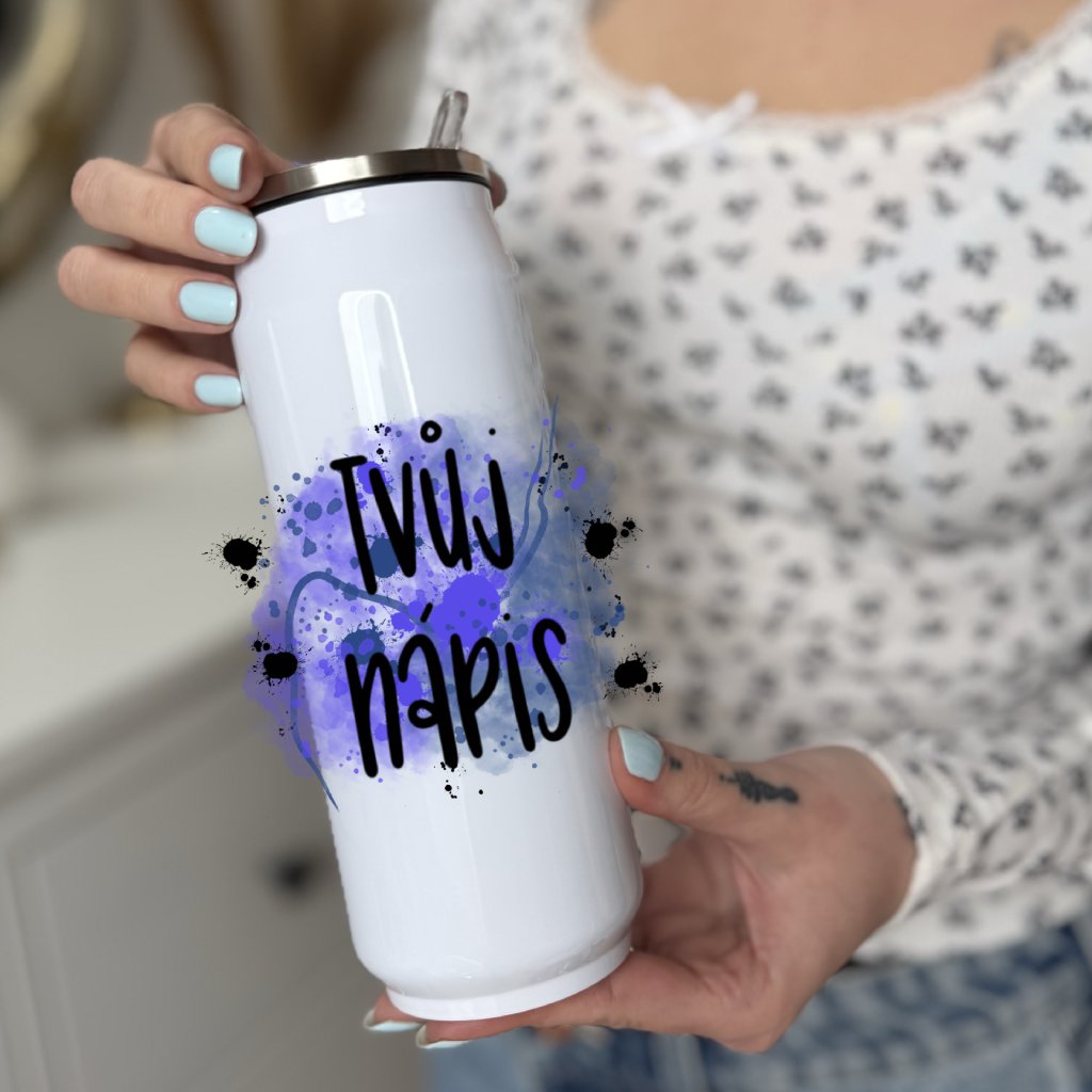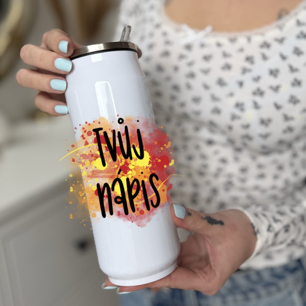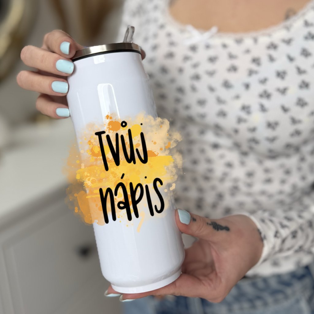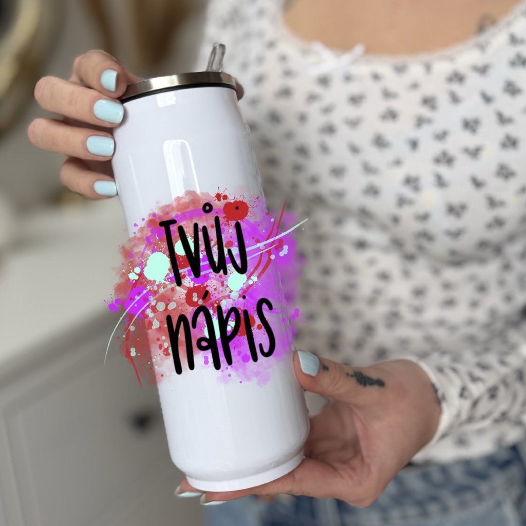 Nerezový dvoustěnný termorhrnek ve tvaru plechovky včetně plastovokovového víčka.